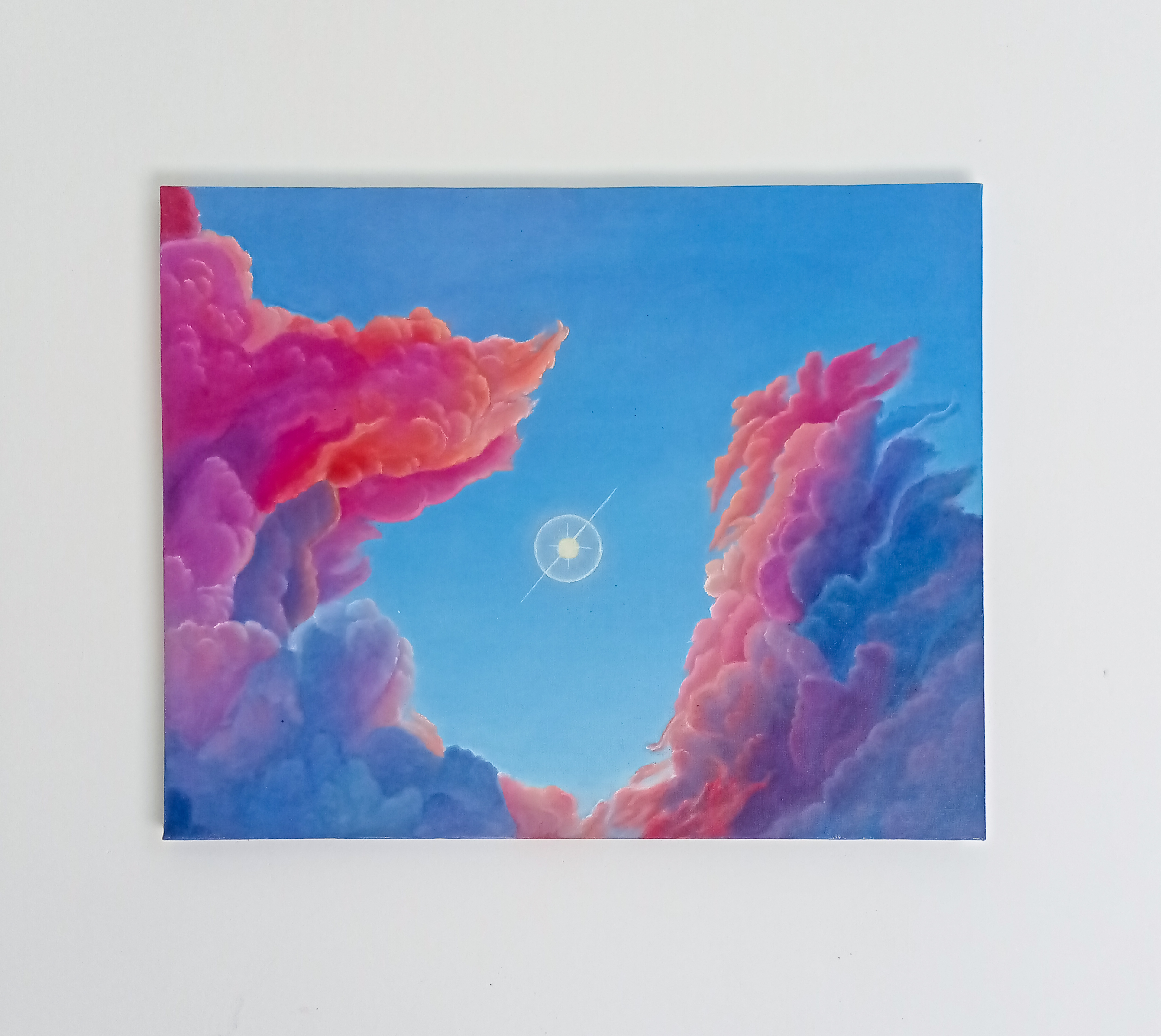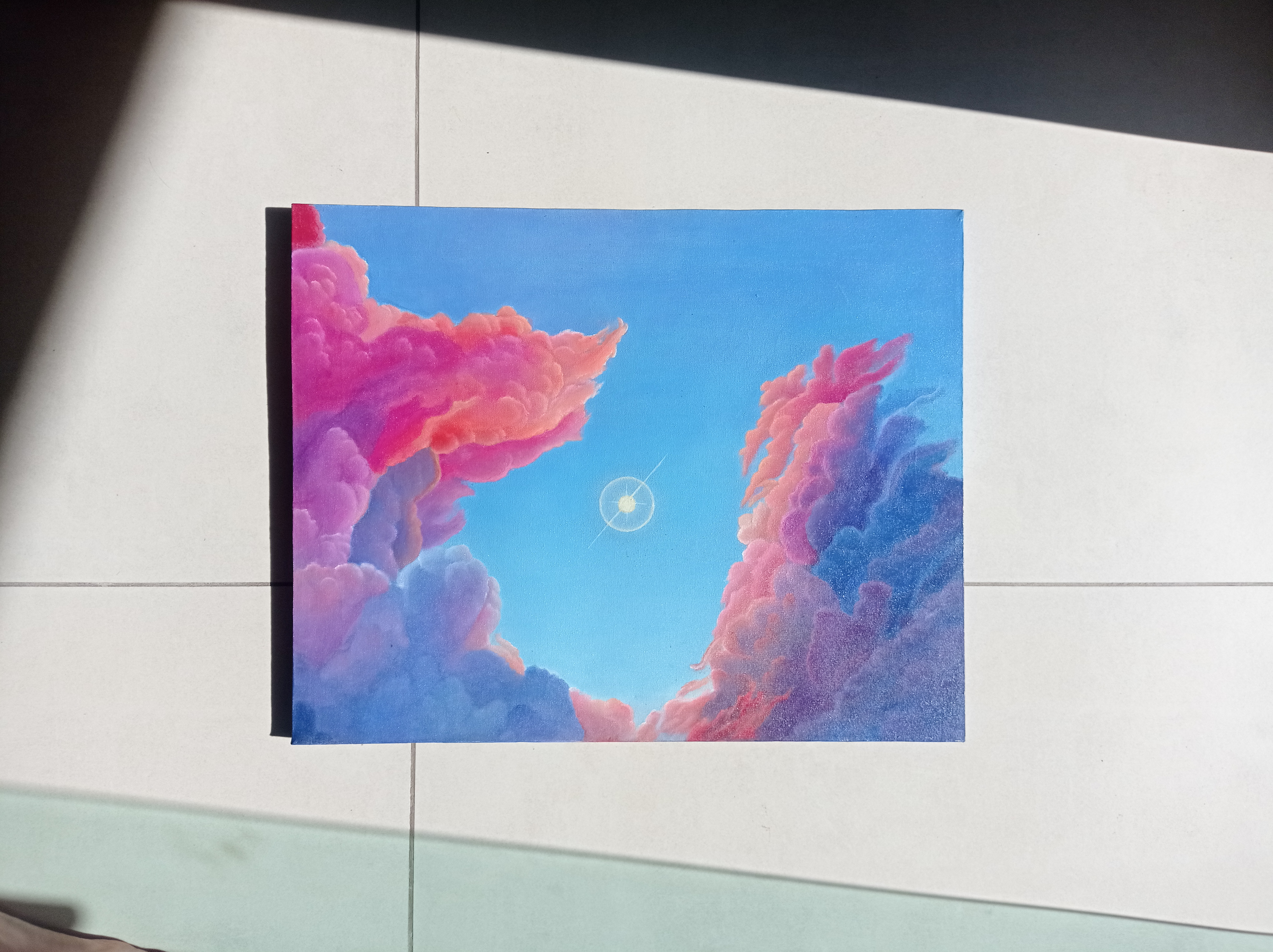 Entre o céu e a alma, nuvens coloridas no céu áureo a brilhar.