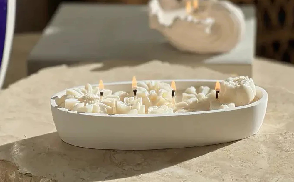 - Design Elegante: Com uma barca de cimento branco e detalhes em cera premium, cada vela é uma peça única.